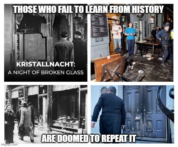 This meme draws a chilling parallel between recent leftist, antisemitic attacks in Melbourne and Kristallnacht—the infamous “Night of Broken Glass” on November 9, 1938. That night, Nazi mobs rampaged through Jewish communities in Germany, destroying over 7,000 Jewish businesses and burning hundreds of synagogues. I like how the angles and framing of the top two images and bottom two images are so similar. It really gives it that "history repeating" vibe. One of the most dangerous historical misconceptions is the belief that the Nazis were far-right. In reality, they were a centre-left socialist workers’ party. Once again, we get an F for history.