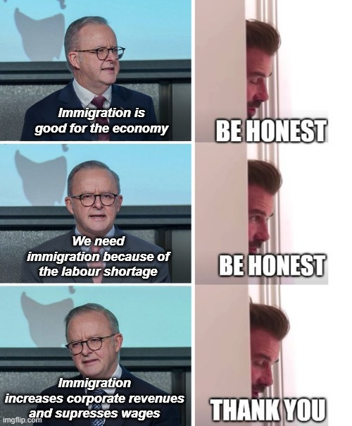 Honesty is not ALP policy. None of the usual excuses for mass immigration hold up under scrutiny. Follow the money, and the real motive becomes clear: boosting corporate profits by growing the market and keeping wages down. We’ll be diving deeper into this in an upcoming article.