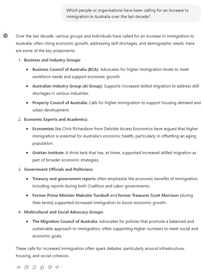In it's answer above, ChatGPT said "various groups and individuals have called for an increase in immigration to Australia, often citing economic growth, addressing skill shortages, and demographic needs", however these are all deliberate lies. When I say immigration is a scam it's not hyperbole. I mean immigration is literally a scam.