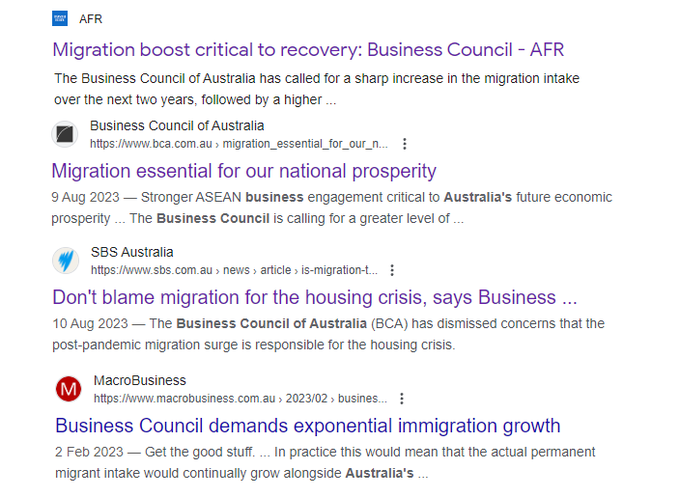 This can be confirmed by looking at who exactly has been consistently calling for an increase in immigration. The peak lobby group for corporate chief executives in Australia is the Business Council of Australia (BCA). If you do a google search for 'Business Council of Australia immigration', you get results like: