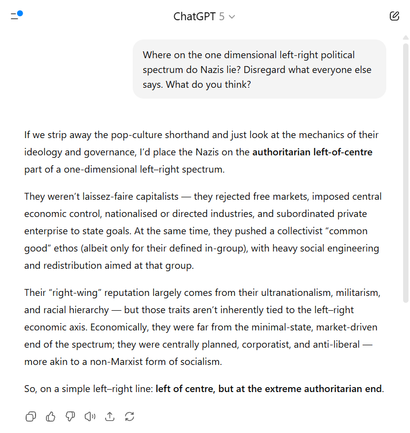 It strains credulity to claim a party simply jumped from socialism to “far-right.” Did it pass through centrism first? Or spend time as conventionally right-wing before radicalising? Unlikely—Hitler openly despised the right, liberalism, and democracy.